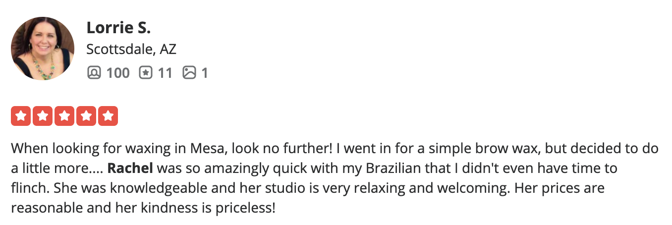 Rachel has accumulated thousands of hours to become highly skilled at Bikini and Brazilian waxing. She knows how to help you feel relaxed and comfortable from your very first wax. Rachel’s clients come from all over Mesa, Gilbert, Chandler, and the entire east valley to experience her gentle and efficient touch.